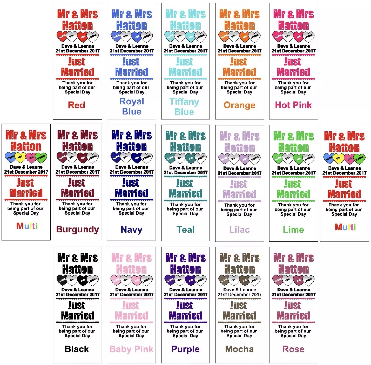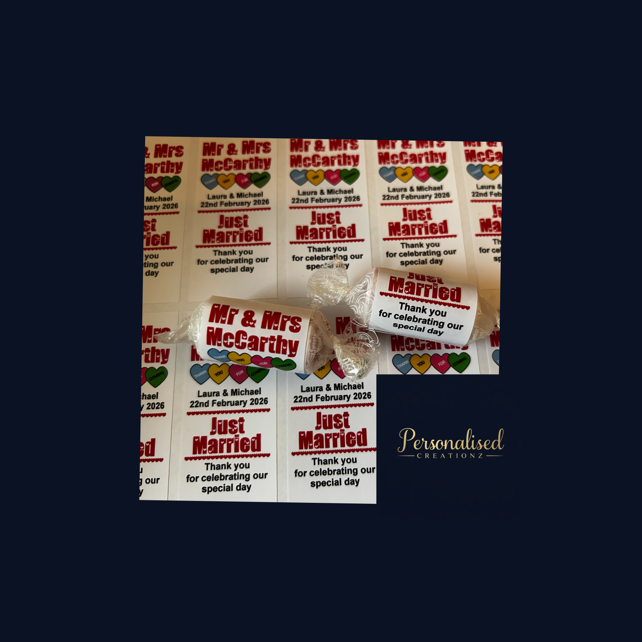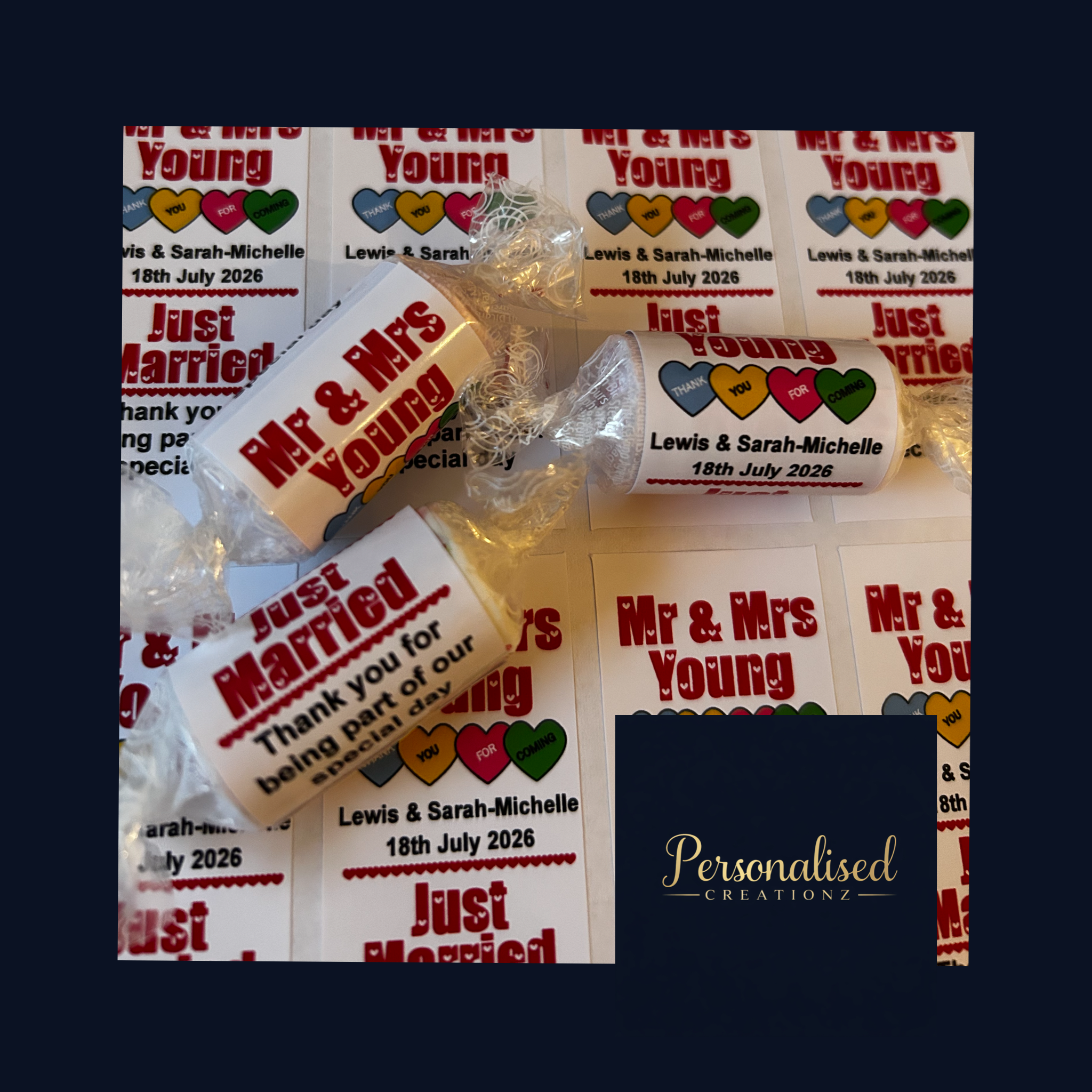 Add a heartfelt touch to your special occasion with our love heart sweets featuring personalised labels. Each sweet packet is customised with your chosen names, date, or short message, making them the perfect favour for weddings, engagements, anniversaries, or Valentine’s Day.
